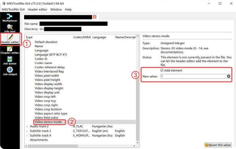 [ヘッダー エディター] をクリックし、[ビデオ ステレオ モード] を 1 に設定します。これにより、ほとんどの 3D SBS映像が適切に再生されるようになります。