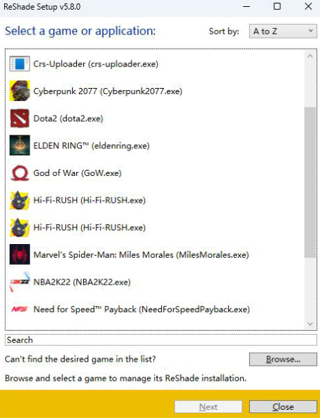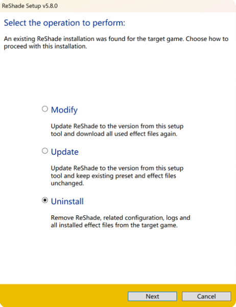 ReShadeをアンインストールしたい場合は、ReShadeを開いてゲームを選択し、このステップで「アンインストール」を選択します。 すべての ReShade エフェクトパッケージもアンインストールされます。
