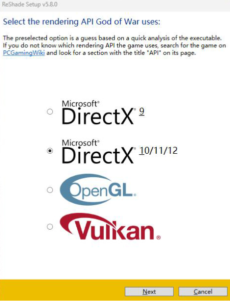 ゲームが使用するレンダリング API を選択し、「次へ(Next)」をクリックしてください。